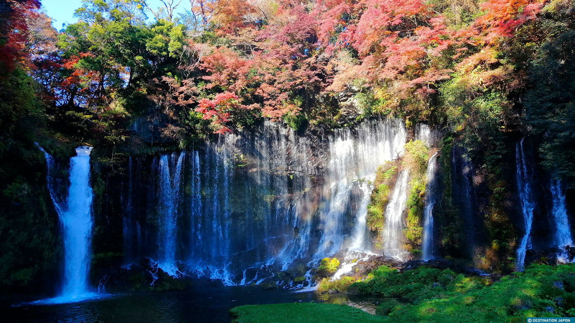 À quelques kilomètres, les cascades de Shiraito offrent une ambiance très différente : plus larges, plus délicates, elles se déploient en une multitude de filets d’eau clairs qui glissent comme des soies blanches le long de la paroi. Leur beauté tient à cette finesse, à cette impression de rideau naturel mouvant, accompagné du murmure constant de l’eau. Entourées de grands érables et de fougères, elles composent un décor presque onirique, particulièrement superbe en été et à l’automne lorsque les couleurs environnantes se reflètent dans les bassins.